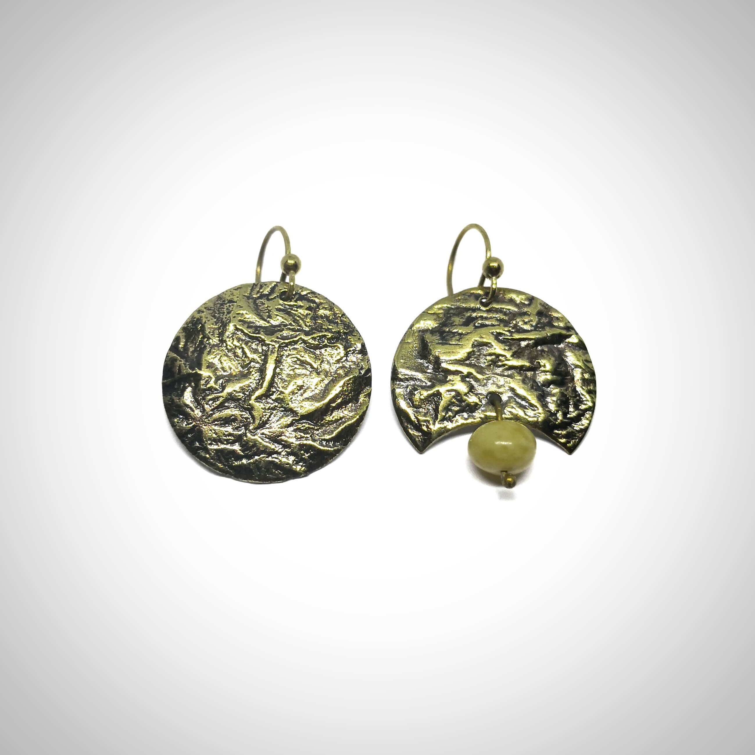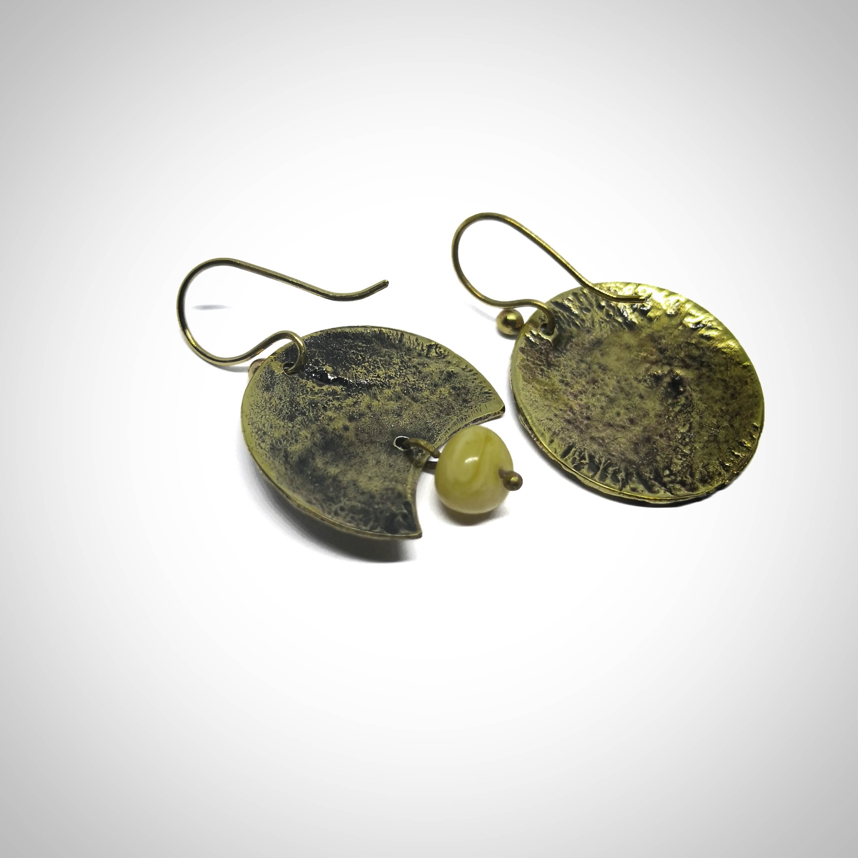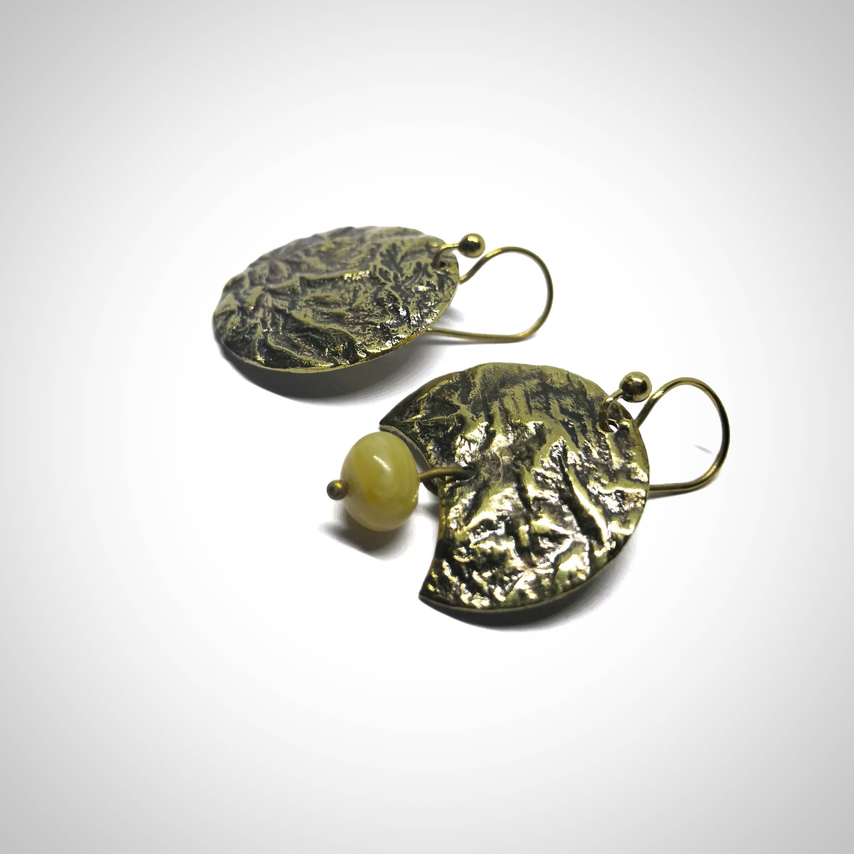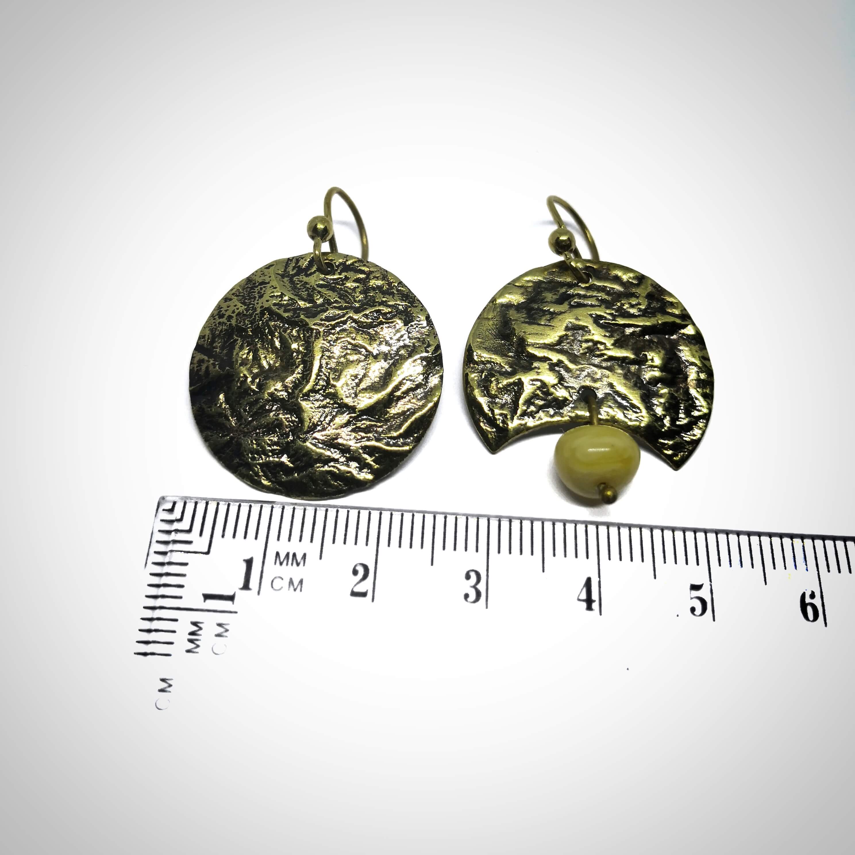 Žalvariniai auskarai su natūraliu gintaru, skirtingi, apie 2,5 cm. skersmens