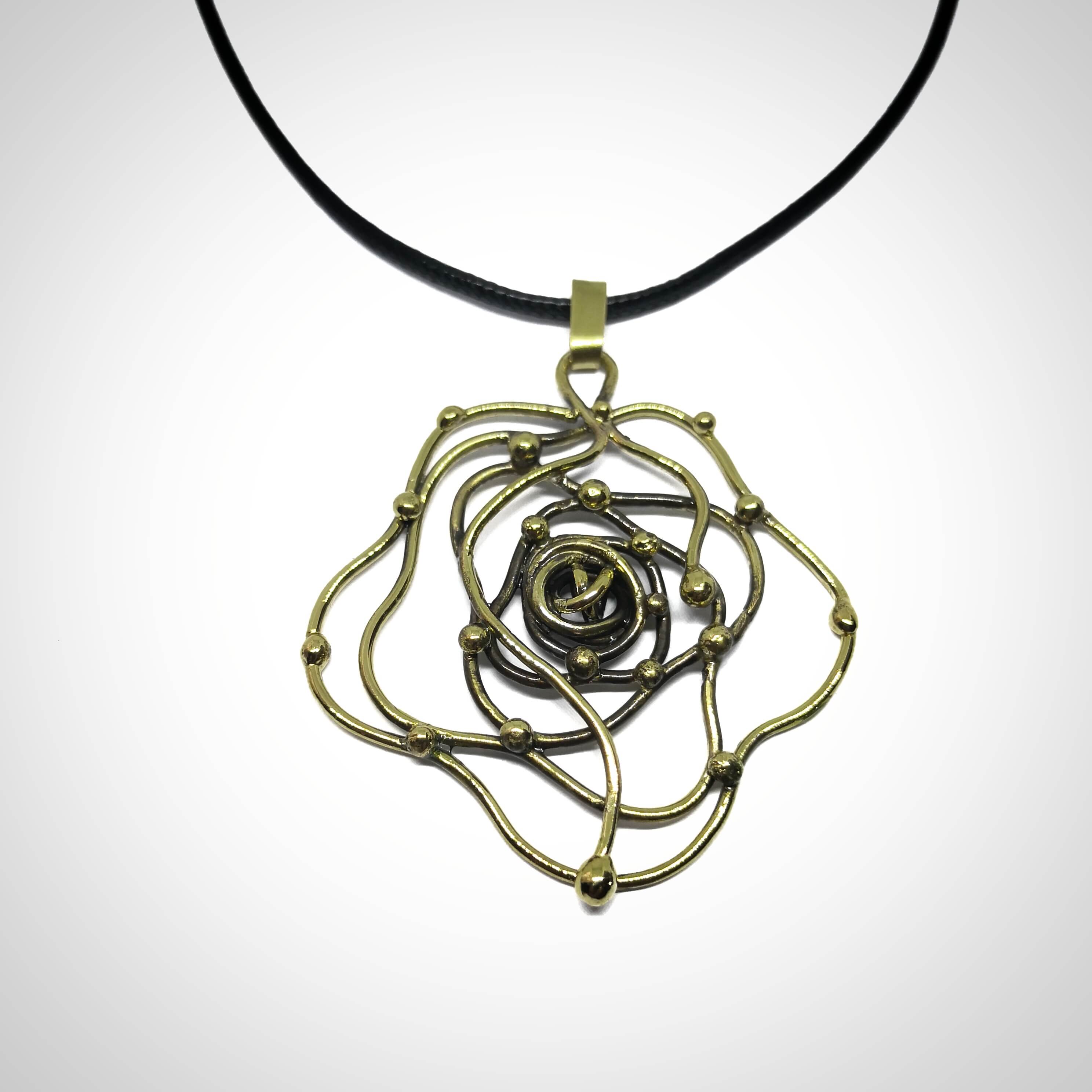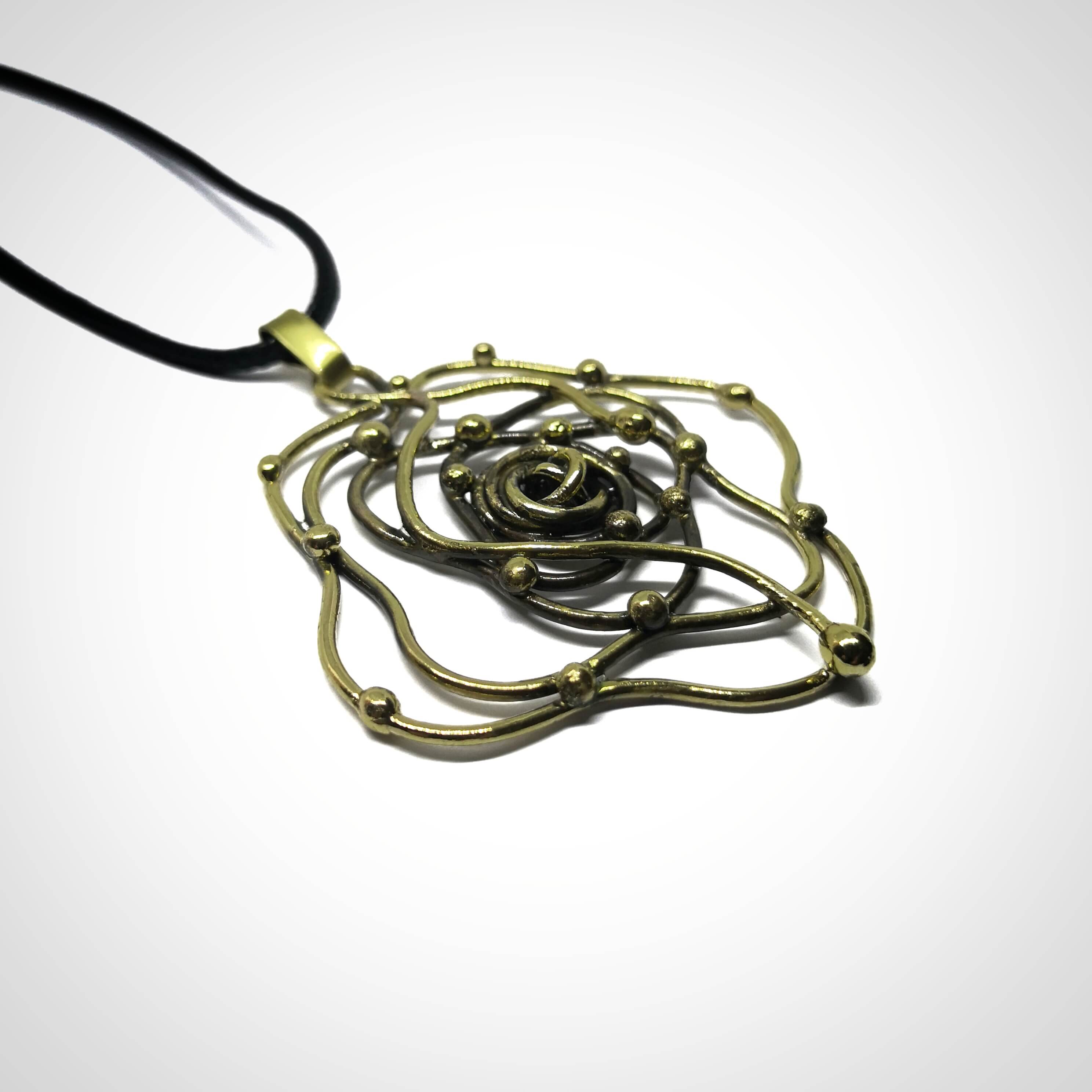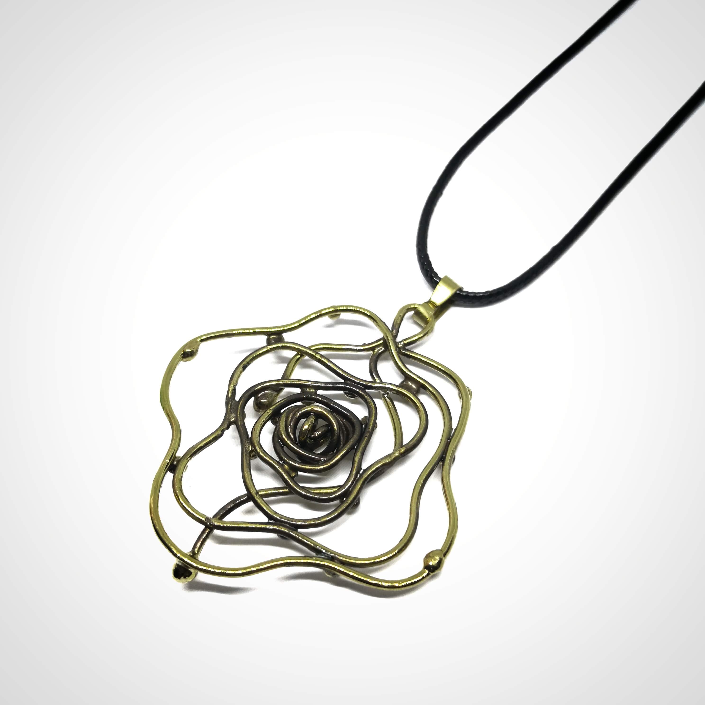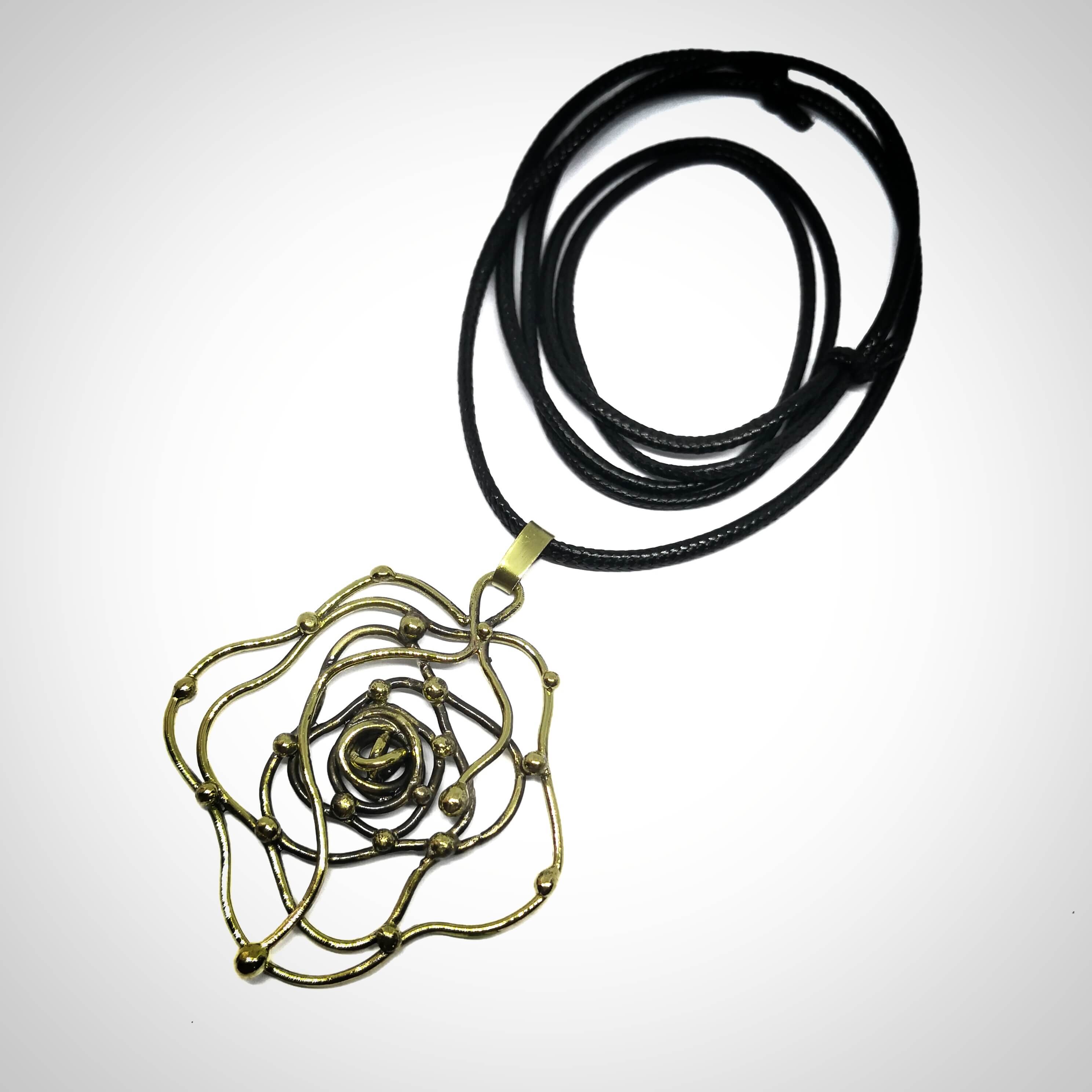 Žalvarinis kaklo papuošalas, apie 6 cm skersmens, reguliuojamo dirželio ilgis - 85 cm
